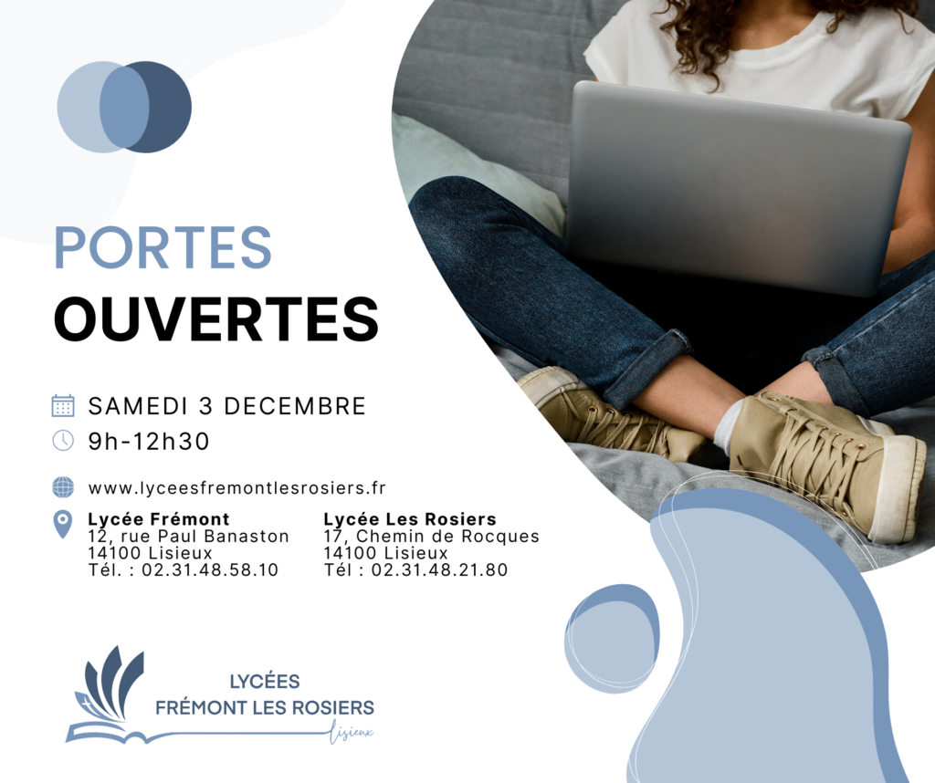 Rappel ! Ce samedi 3 décembre se dérouleront les portes ouvertes des Lycées Frémont et Les Rosiers de Lisieux de 9H00 à 12H30. Venez découvrir nos Lycées et nos formations. Vous serez accueillis par nos élèves qui vous accompagneront tout au long de votre visite. Nous vous attendons nombreux.