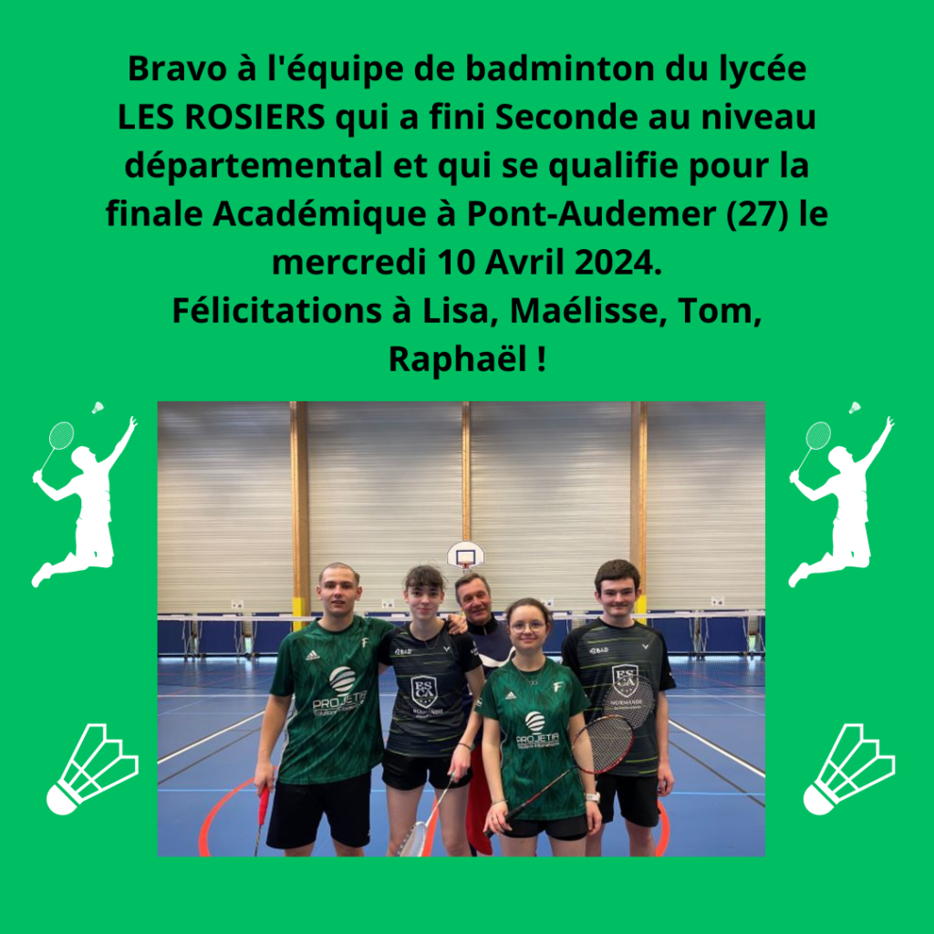 Bravo à l’équipe de badminton du lycée LES ROSIERS qui a fini Seconde au niveau départemental et qui se qualifie pour la finale Académique à Pont-Audemer (27) le mercredi 10 Avril 2024. Félicitations à Lisa, Maélisse, Tom, Raphaël !