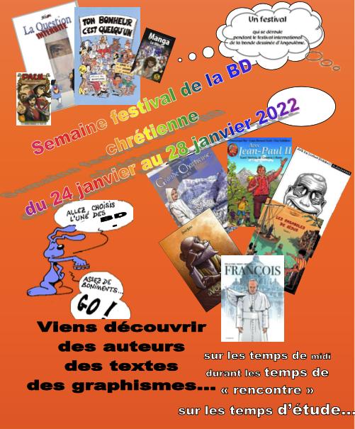 Les élèves des lycées Frémont et Les Rosiers ont pu découvrir (sur les temps de midi, de « rencontre » ou encore sur les temps d’étude) des auteurs, des textes et des graphismes lors de la semaine festival de la BD chrétienne, du 24 au 28 janvier en lien avec l’animation pastorale des établissements. Cette semaine a lieu pendant le festival international de la bande dessinée d’Angoulême.